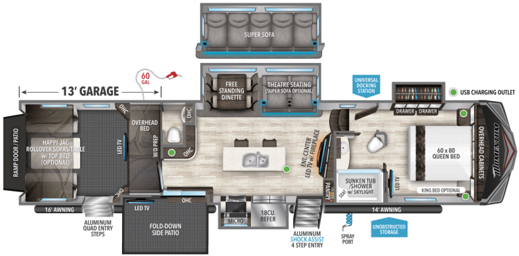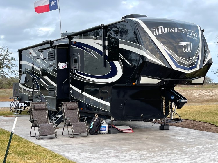So, some things about this “big girl” as a lot of people refer to her! Again, it is a Grand Design (manufacturer) Momentum (product line) 399TH (toy hauler) purchased and ordered through Crestview RV in Buda, Texas. The process we went through is a subject of an upcoming blog post. We ordered her in late September of 2019 and she arrived mid November of the same year. Here is the spec sheet for the rig …