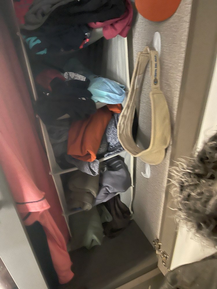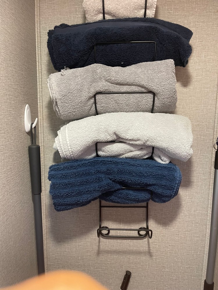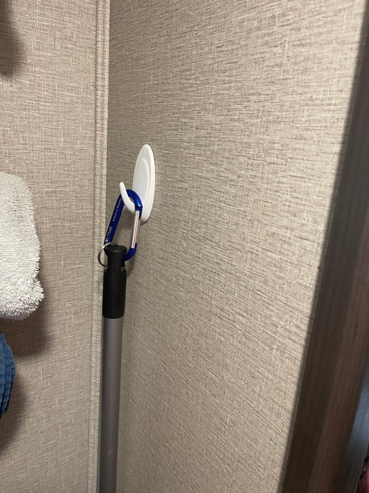 The last little item in the bedroom is one of my favorites … a closet organizer that is also available online or at your local Home Depot or Lowe’s in the home organizer area. In most rigs, but especially in ours, closet space is minimal and we are always looking for a way to better maximize the space. This little thing allows me to create a ton more usable space than I could ever get than if I just hung everything up. It is particularly good for those things that can be folded or rolled up and where getting them a little wrinkled isn’t a concern!