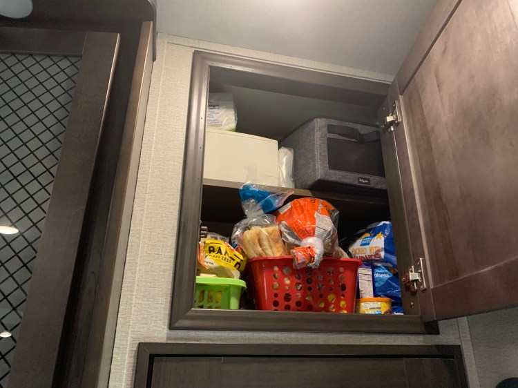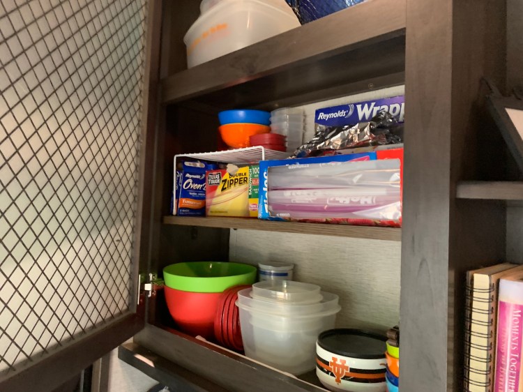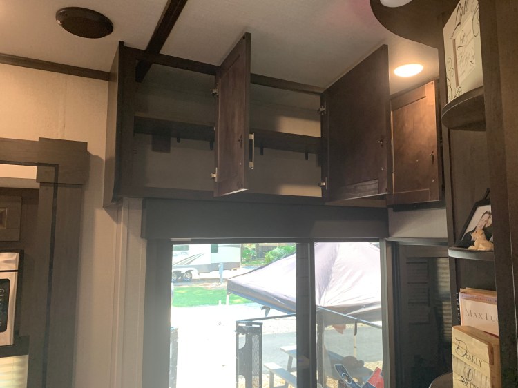 While there is quite a bit of cabinet space most of the cabinets were very deep and high at the same time. So, I simply added an additional shelf to the area above the pantry, the cabinets above the sliding glass door and to the cabinets above the coffee bar. This literally doubled the amount of actual shelf space in the living area with a minimal amount of effort. I purchased pre-made shelving( that matched our current trim perfectly) from Home Depot, cut it to fit and secured them with 90 degree brackets. Simple mod that made a huge difference!
