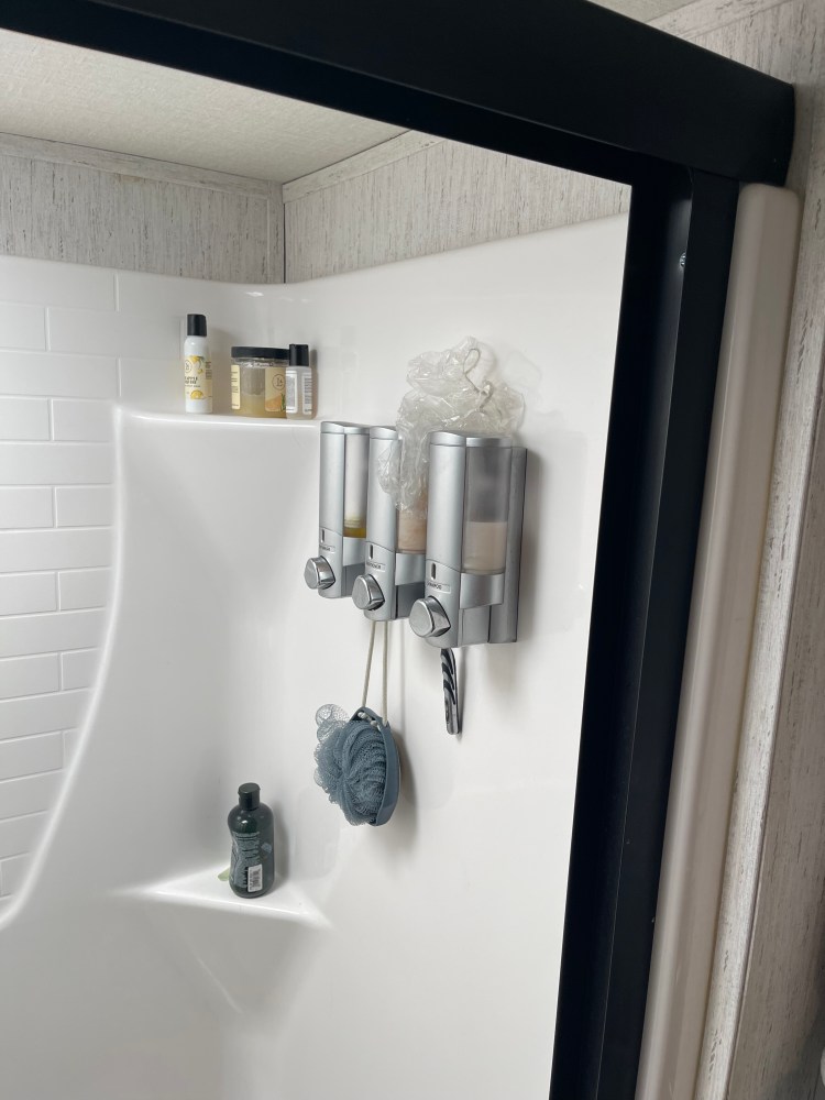 The third is also “simple” as a matter of fact it is called a SimpleHuman 3 chamber dispenser. I can’t believe it has survived all of the rocking and rolling the rig suffers from going down the road but it is solidly attached to the shower wall right where I put it the first day! We love how efficient it is and how it keeps the shower neat!