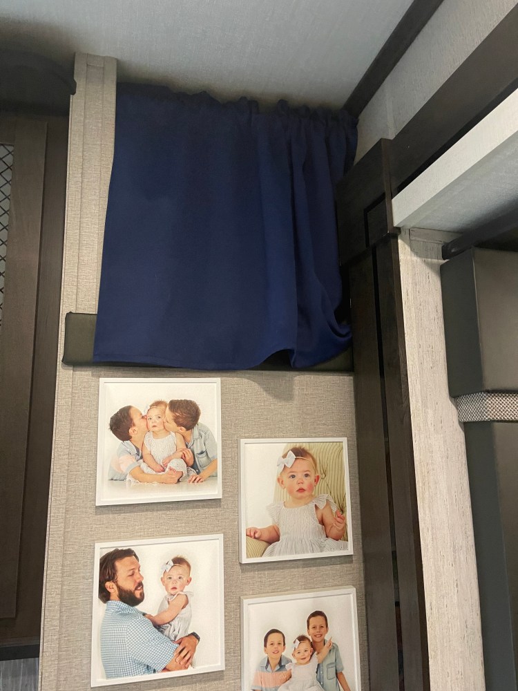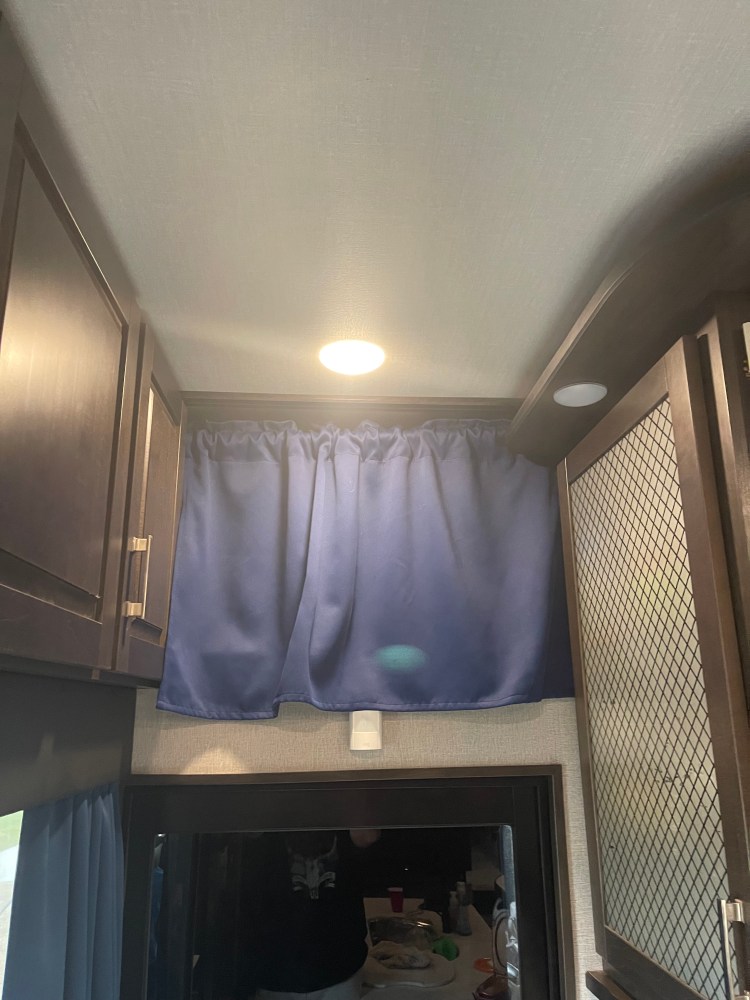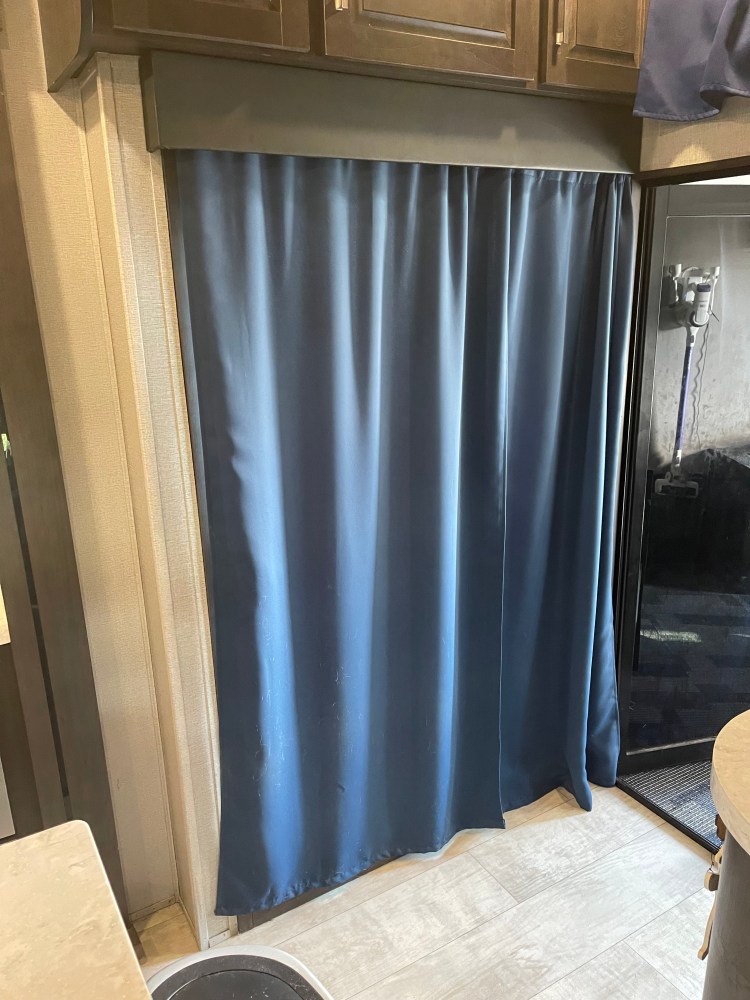 Our next mod in this area was to add curtains that covered up the two entries into the loft. We measured the openings and bought the rods and curtains on Amazon to fit each. Note: All of the curtains in our rig came from the same manufacturer so they match throughout. We also added a matching curtain and curtain rod to fit the sliding glass door. This curtain serves several purposes. It provides privacy, because it is a blackout curtain it helps with both cold and heat and it looks nice in the living area even when we haven’t deployed the side porch!