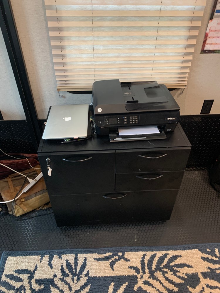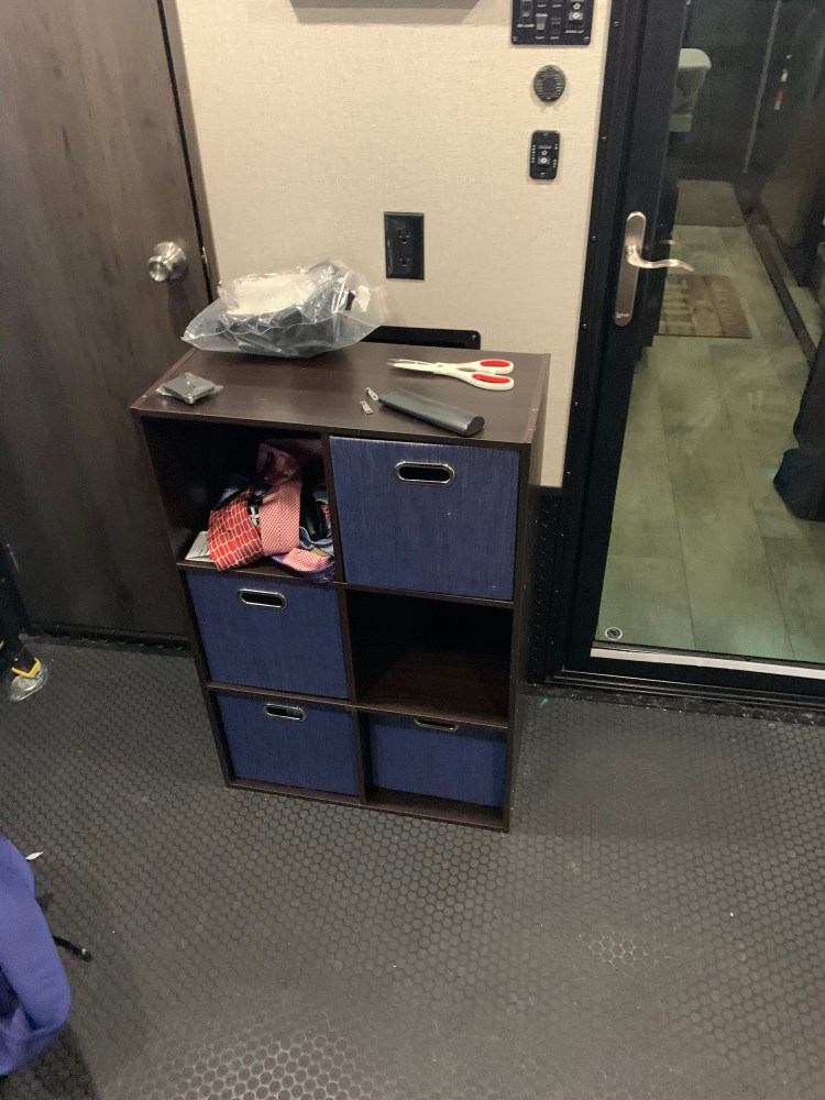 Other mods in this space include adding a file cabinet, a really cool and functional 6 drawer cubby and, of course, a blackout curtain that covers up our sliding glass doors that lead out onto the back patio. Just like the curtains on the side patio door they provide privacy, help with the heat and cold and they give a finished look to the office that we really like! One note on these curtains. We originally used an expanding tension curtain rod here like you might use in a shower at home. The problem is it kept falling down during transit and we broke two of them. We now attach the curtain using Command Hooks. While not as attractive it works!!!