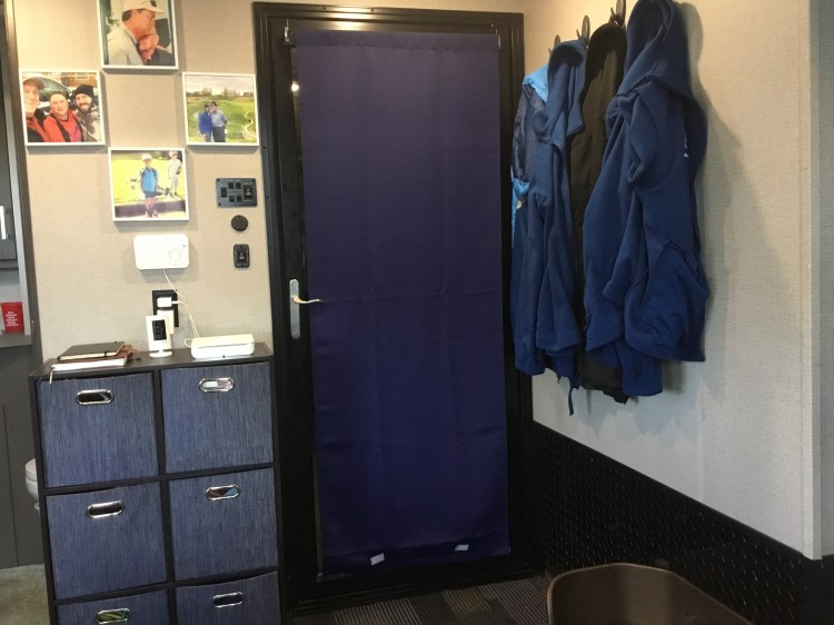 Probably the first mod you will notice is the privacy curtain on the door leading to the office. Again, a black out curtain that matches all of the others and it is secured by a very simple curtain rod like you might find over a window in your home. This curtain rod is attached to the door by screws! Yep, drilled them into the door with great care and trepidation!!!