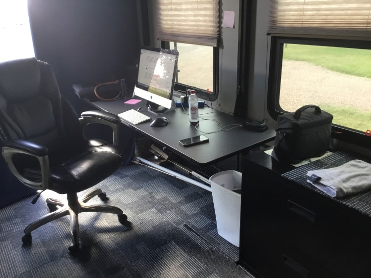 As we move from the living area to the garage there is so much to share! Again, one of the primary reasons we settled on a toy hauler was for the opportunity to convert this space into our office. We both still work and this space has been very important to us! While we love how it is set up now it is still a work in progress! We are constantly looking for new and better ways to make it as comfortable and efficient as possible!